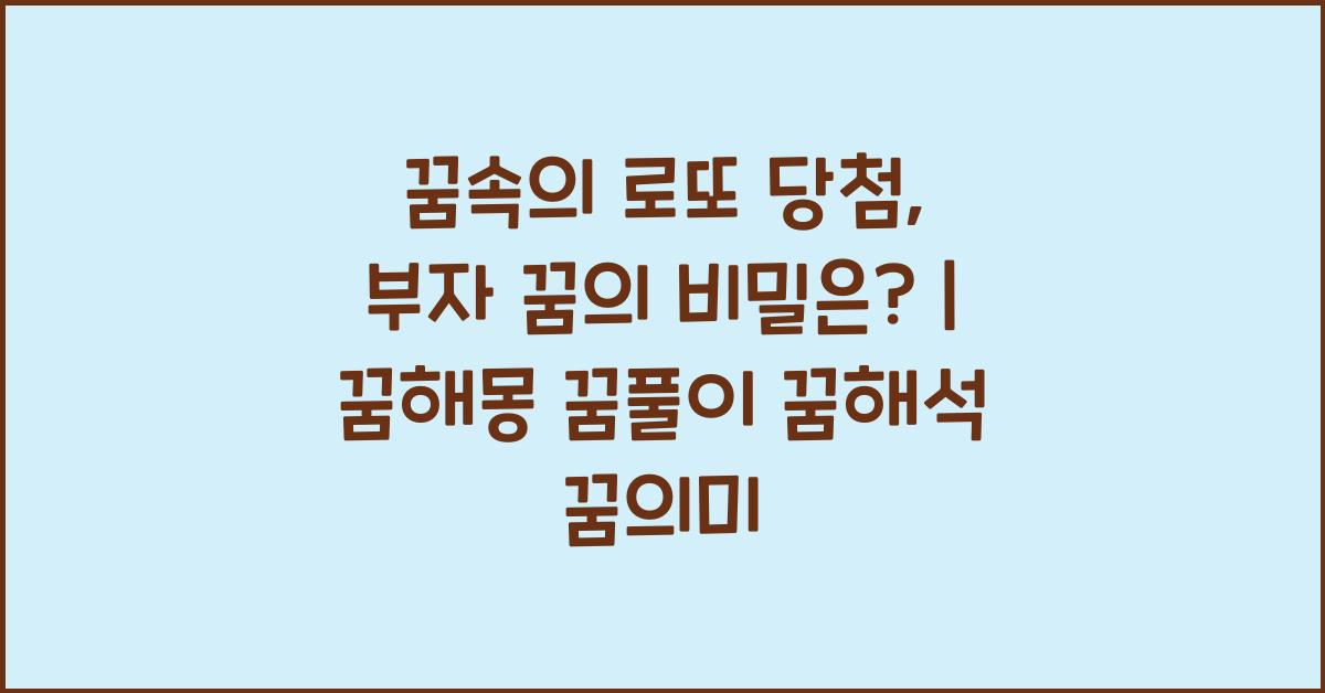 A1: 꿈속의 로또 당첨은 여러분의 재물에 대한 갈망을 반영하며, 소원 성취의 암시일 수 있습니다. 이 꿈은 일종의 동기부여로 작용하기도 합니다.
