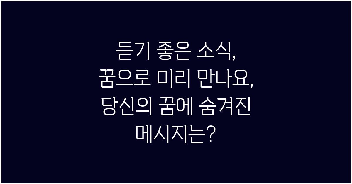 꿈의 해석은 주관적이지만, 때로는 우연히 그 답을 찾을 때가 많습니다. 듣기 좋은 소식, 꿈으로 미리 만나요라는 메시지가 저에게 그러한 긍정적인 기운을 전달해 주었습니다. 꿈은 우리의 심리를 반영하며, 내면의 소리에 귀를 기울이게 합니다.