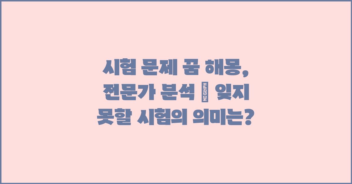 시험 문제 꿈 해몽, 전문가 분석 | 꿈해몽 꿈풀이 꿈해석 꿈의미는 우리에게 중요한 메시지를 전달합니다. 이 꿈을 통해 우리는 자신의 감정을 이해하고, 더 나은 방향으로 나아가기 위한 원동력을 얻을 수 있습니다. 우리가 마주치는 시험이라는 상징이 단순한 형식이 아니라는 점을 잊지 말아야 합니다.